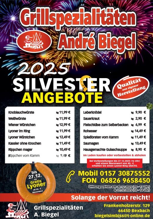 Gerne könnt ihr jetzt schon vorbestellen, denn für jede Vorbestellung bis zum 27.12.2025 um 16 Uhr, ab 40 € Warenwert erhaltet ihr einen Ring Lyoner gratis. Vorbestellungen nehmen wir per Telefon, E-Mail oder auch gerne an einem unserer Imbisse an.